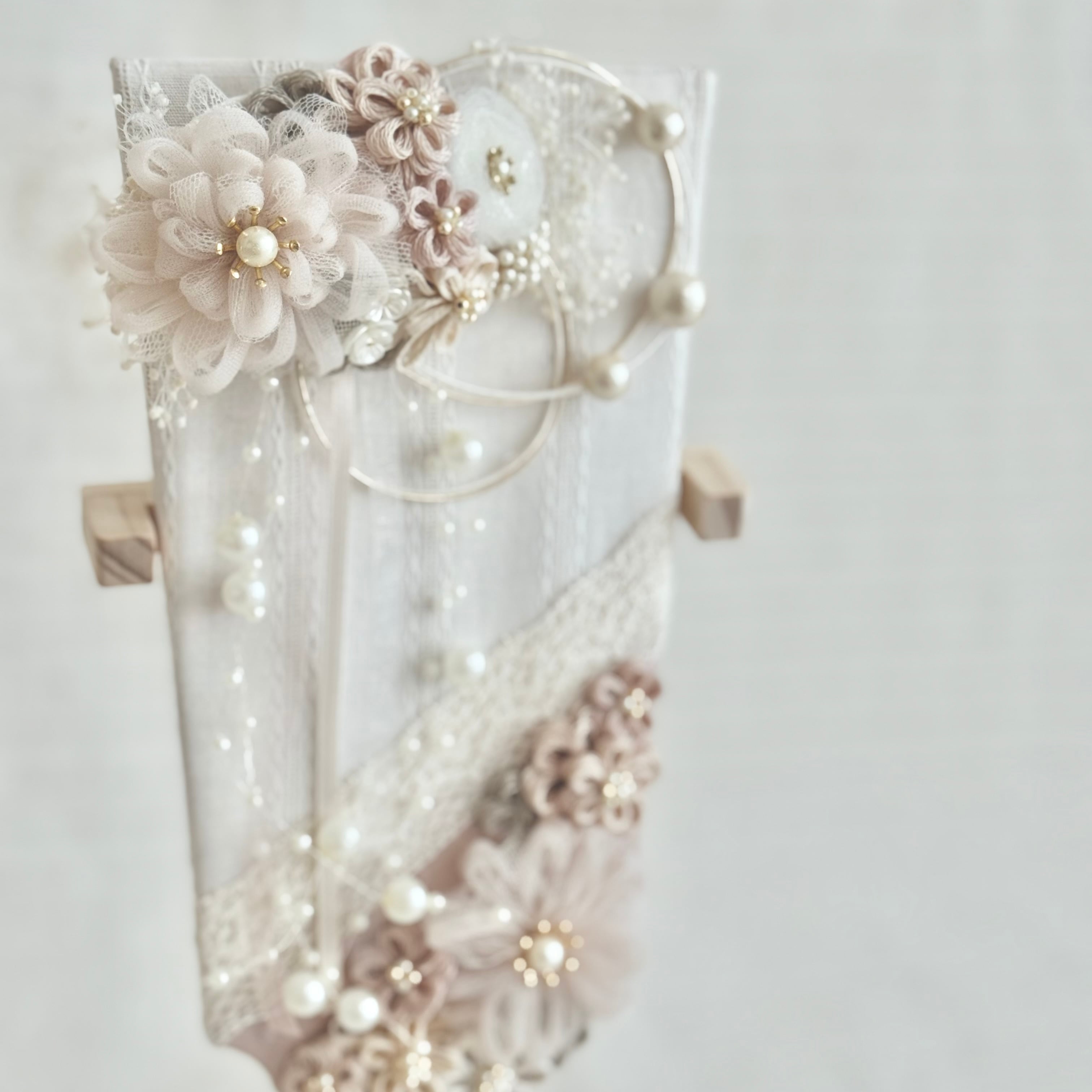 優しい色合いのお花を散りばめた羽子板飾りです