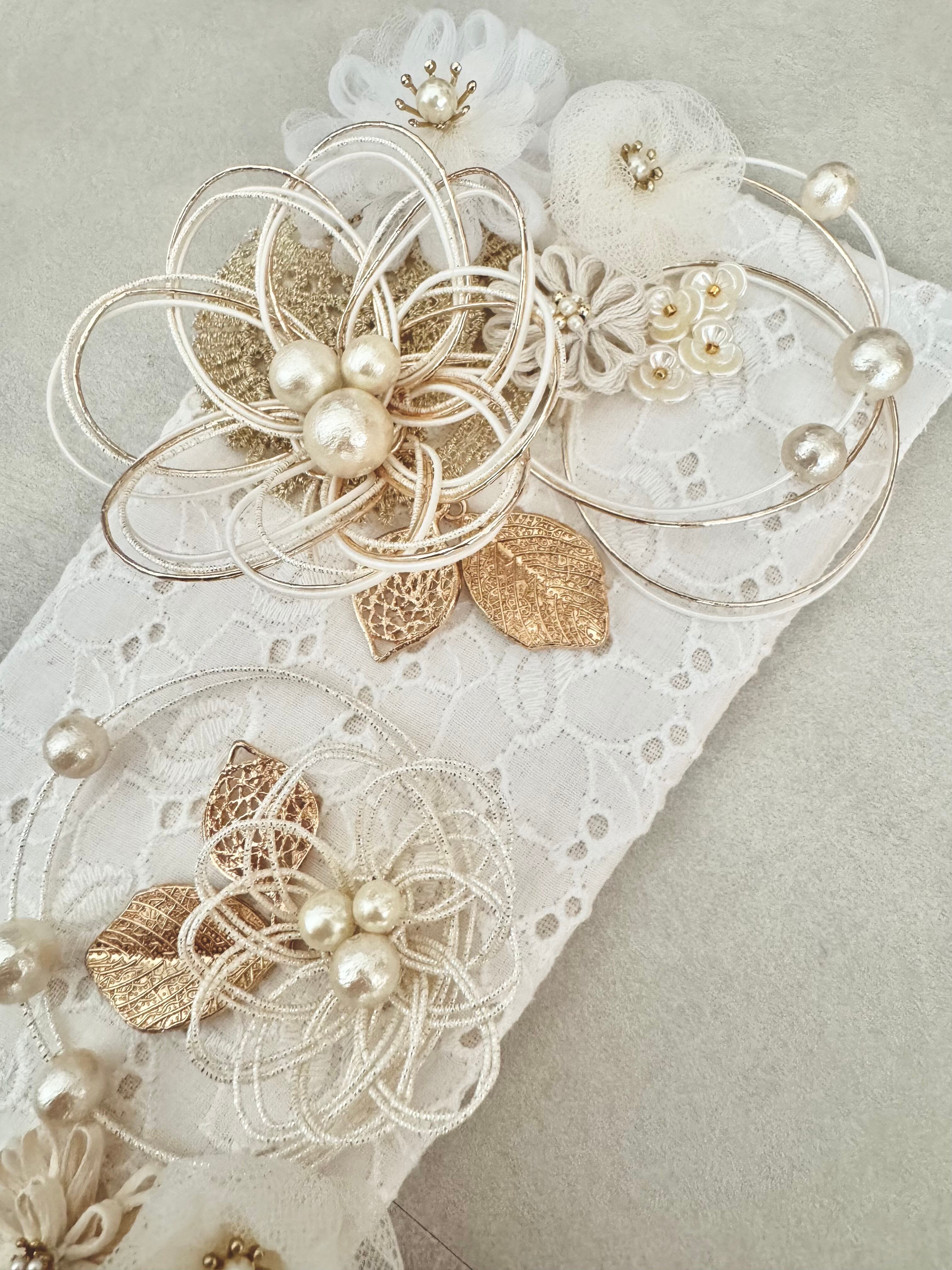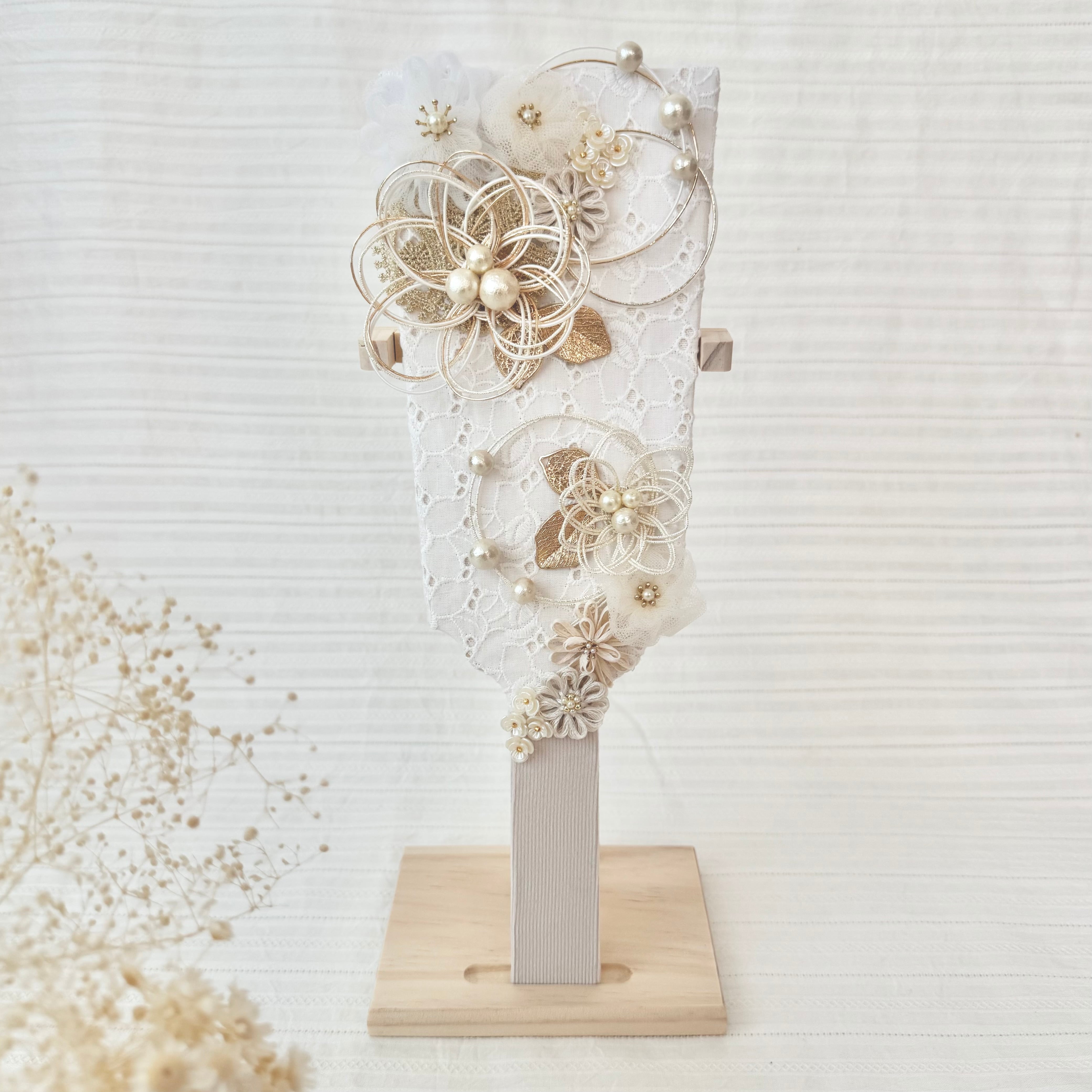 水引やいろいろな素材のお花をアレンジした羽子板飾りです。